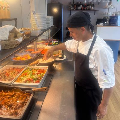 Buffet sisältää monipuolisen salaattipöydän, keiton, kaksi lämmintä pääruokavaihtoehtoa, talon omaa tuoretta leipää, jälkiruoan sekä kahvin tai teen.